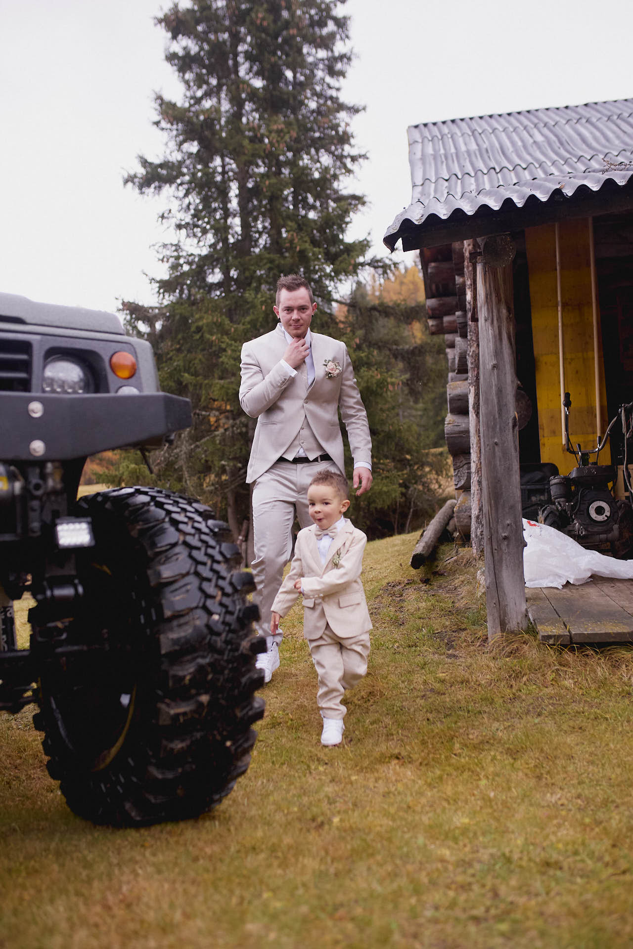 Dopo la cerimonia, gli sposi hanno scelto di immortalare il loro amore in un luogo molto significativo per loro: la loro baita nel cuore delle Dolomiti. Nonostante la pioggia, il paesaggio autunnale ha regalato una scenografia mozzafiato, con le foglie dorate dei larici e la nebbia leggera che avvolgeva le cime. Ogni scatto raccontava la profondità del loro legame, un mix perfetto tra romanticismo ed emozione pura.
