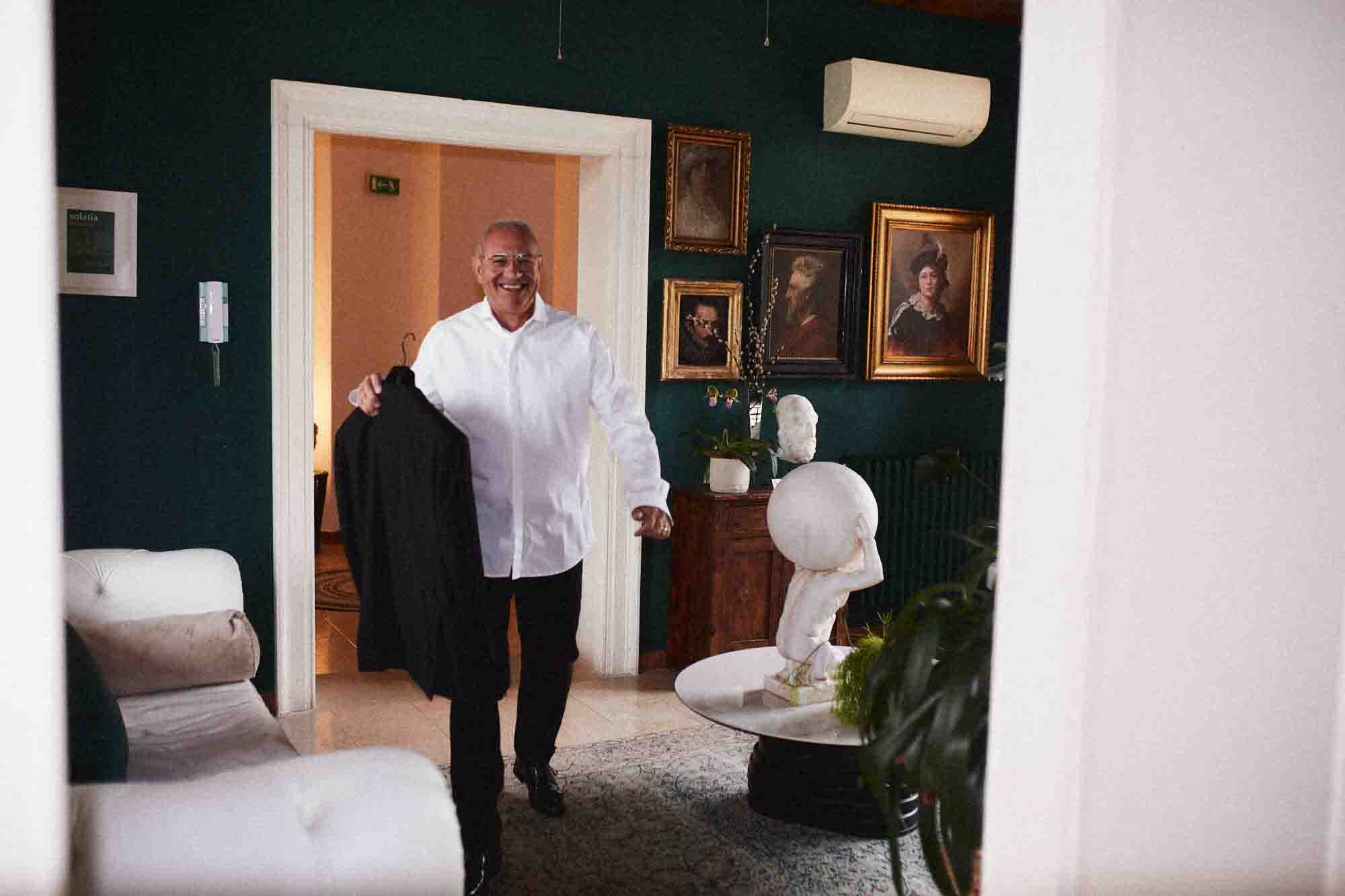 Prima della cerimonia, Virginia si preparava al piano superiore della villa, in una mansarda con le travi a vista e la luce che entrava obliqua dai lucernari. Ho fotografato il suo riflesso in uno specchio — uno sguardo silenzioso, consapevole, trattenuto. E poi lei di spalle davanti a una finestra, lo sguardo perso verso il giardino che la aspettava.