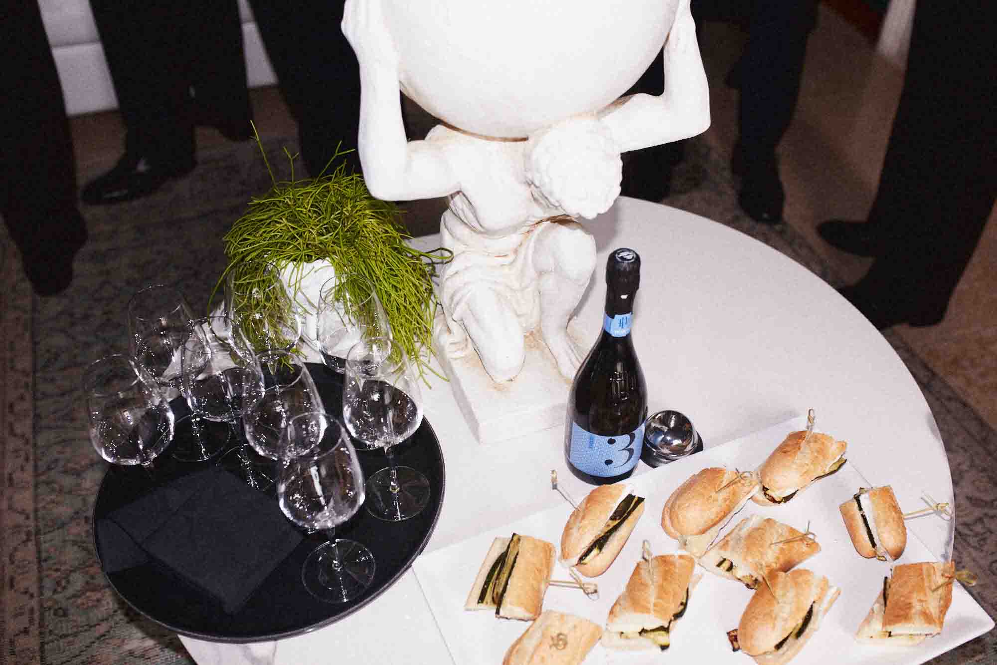 Durante l’aperitivo, un tavolo di marmo accostato a una scultura in gesso, una bottiglia di spumante, panini gourmet disposti con cura. Non era un dettaglio marginale. Era il tono del pomeriggio intero.