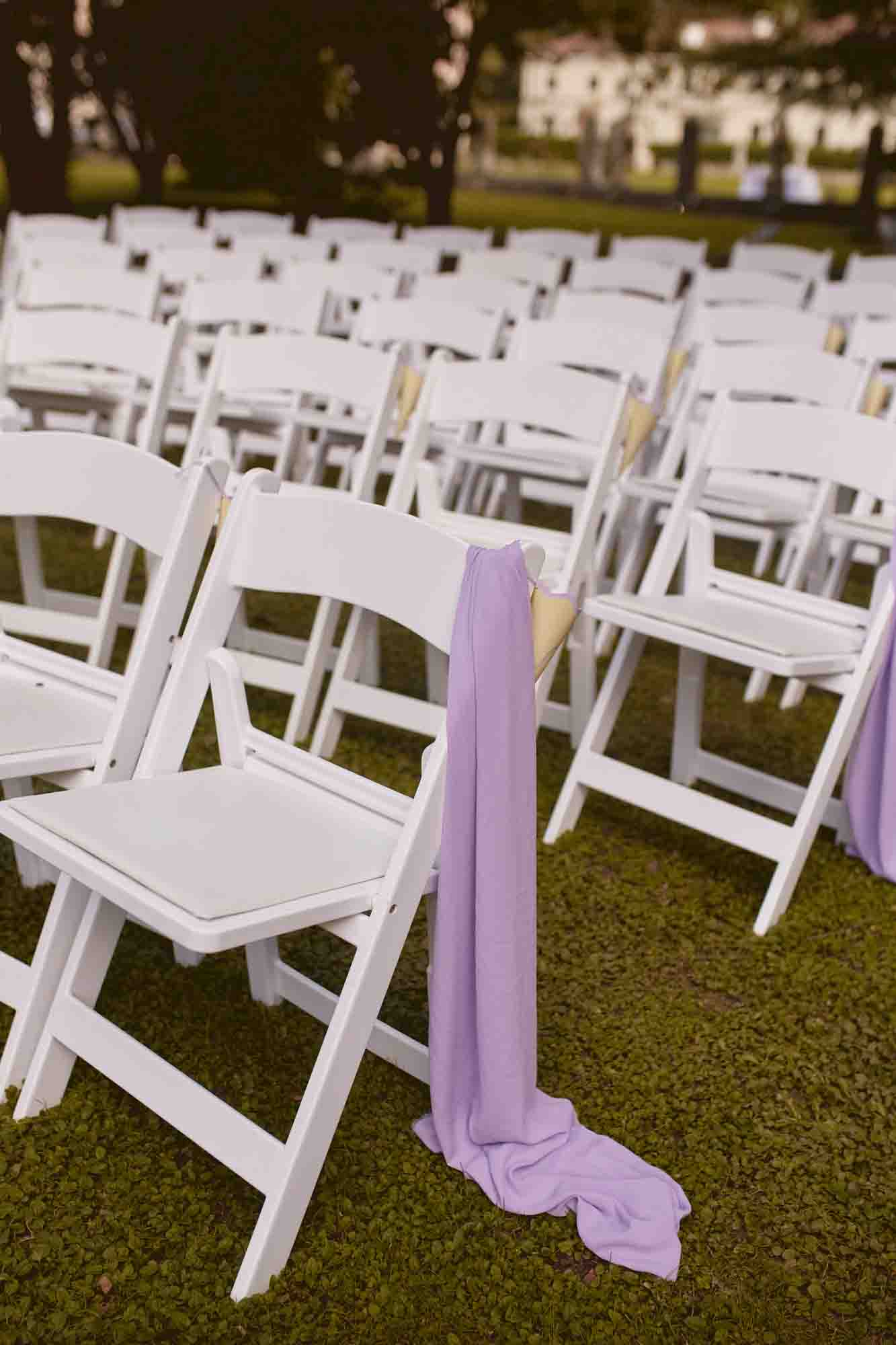 C’è una fotografia che ho scattato quel giorno, prima ancora che iniziasse qualcosa. Sedie bianche disposte in fila sul prato, un drappo lilla che segna il corridoio, composizioni di erbe pampas e fiori mossi da un’aria leggera. Nessuno ancora seduto. Il giardino della villa in silenzio, carico di un’attesa che si poteva quasi toccare.
