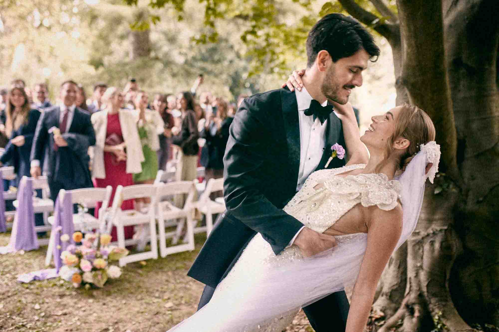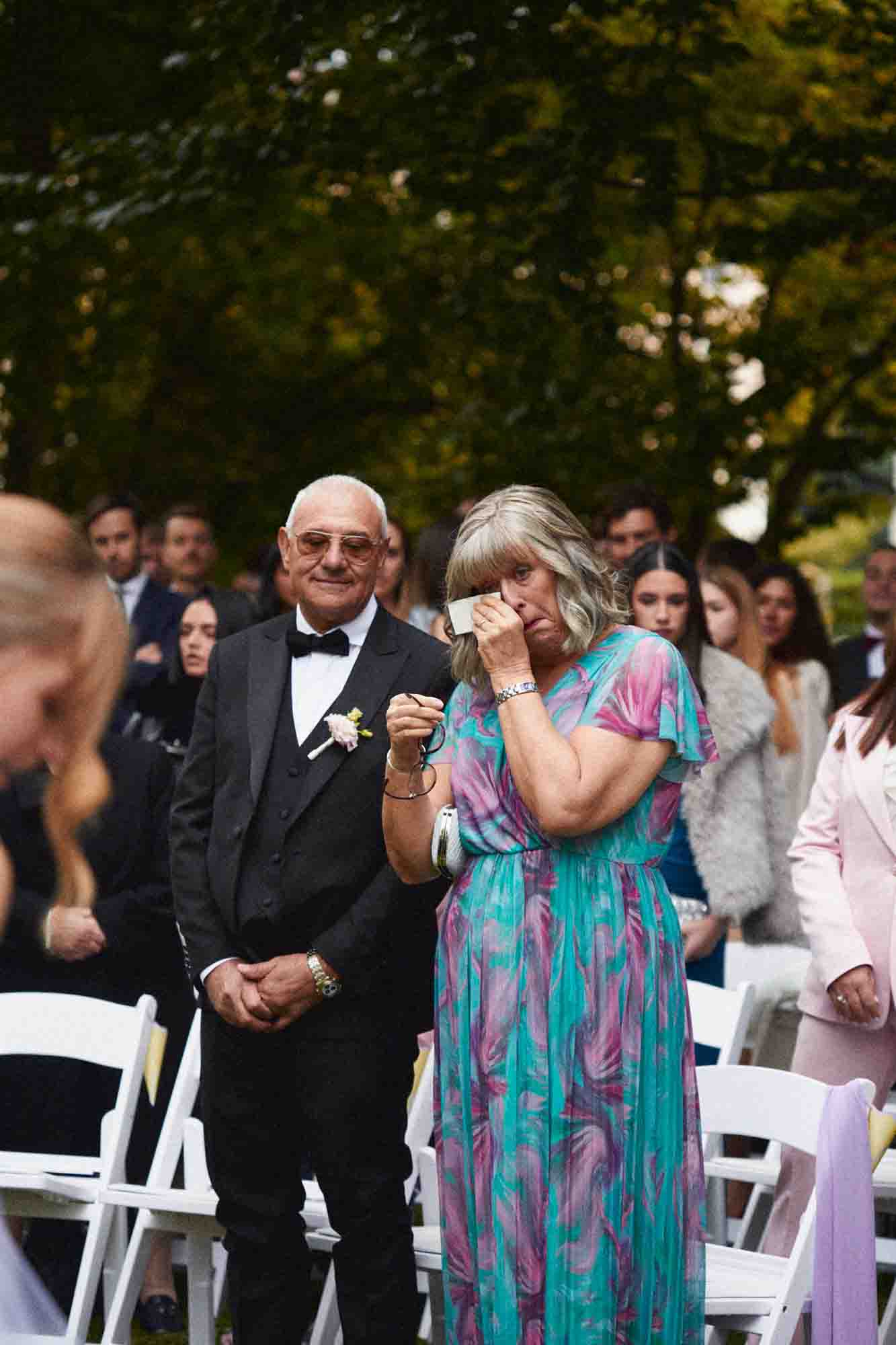 La cerimonia si è svolta all’aperto, in quella stessa scenografia che avevo fotografato vuota pochi minuti prima. Gli ospiti arrivavano da ogni parte del mondo — smoking diversi, accenti diversi, modi di abbracciarsi diversi — eppure nel momento in cui si sono seduti su quelle sedie bianche, erano tutti lì per la stessa cosa.