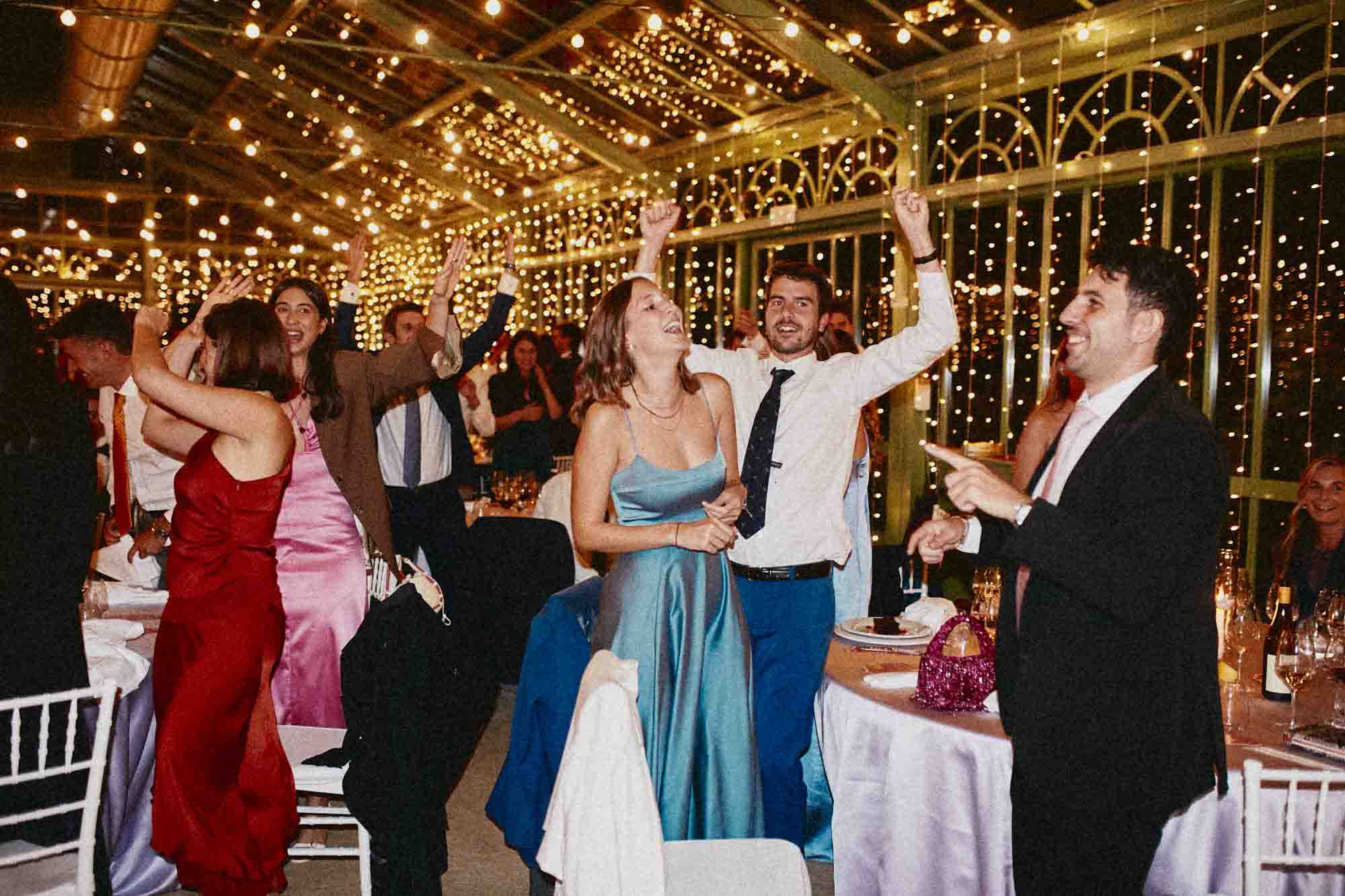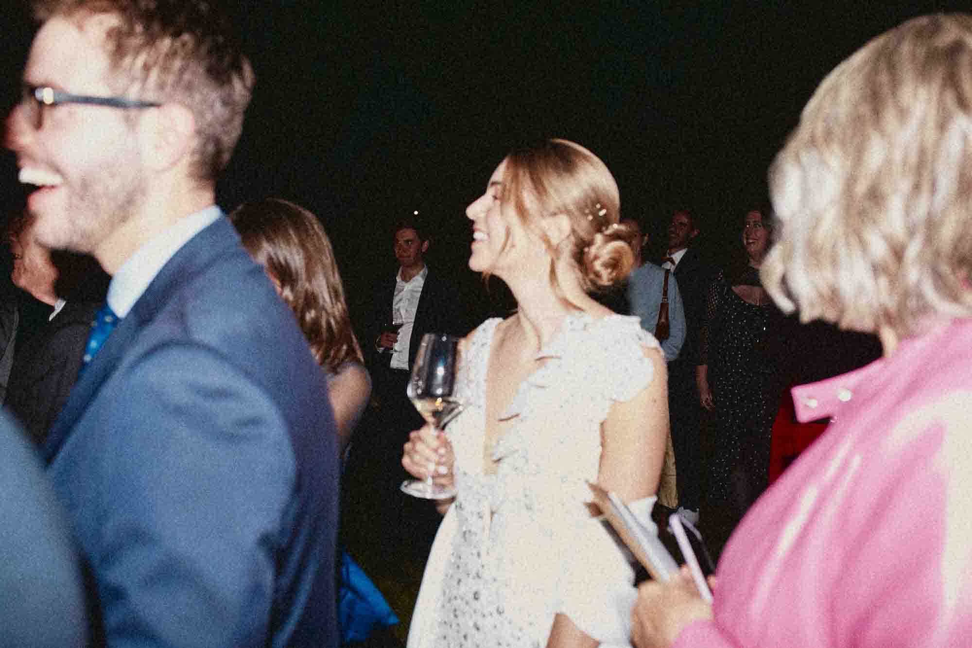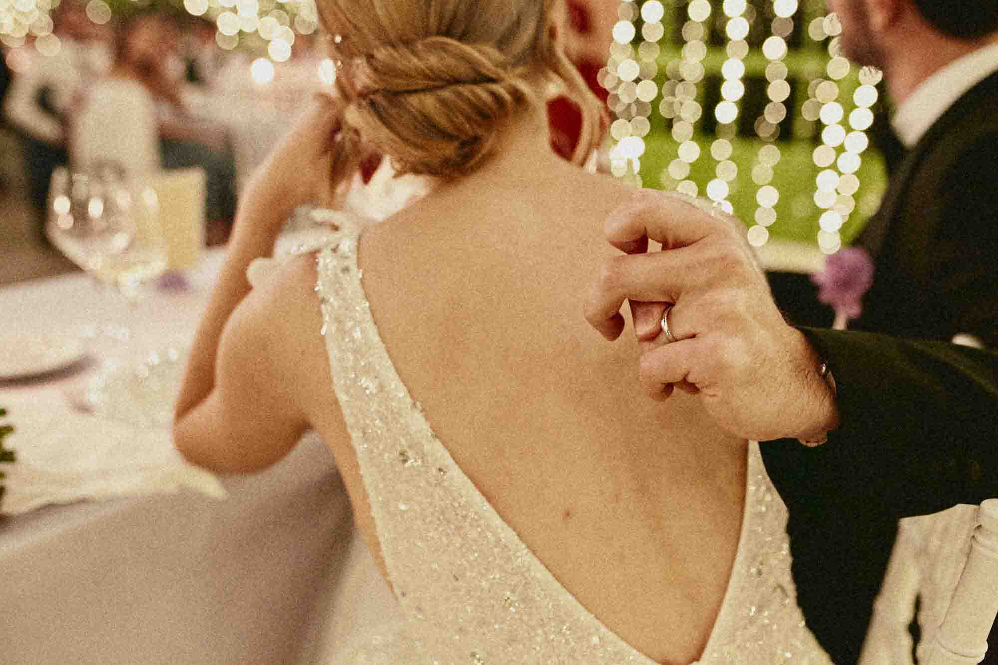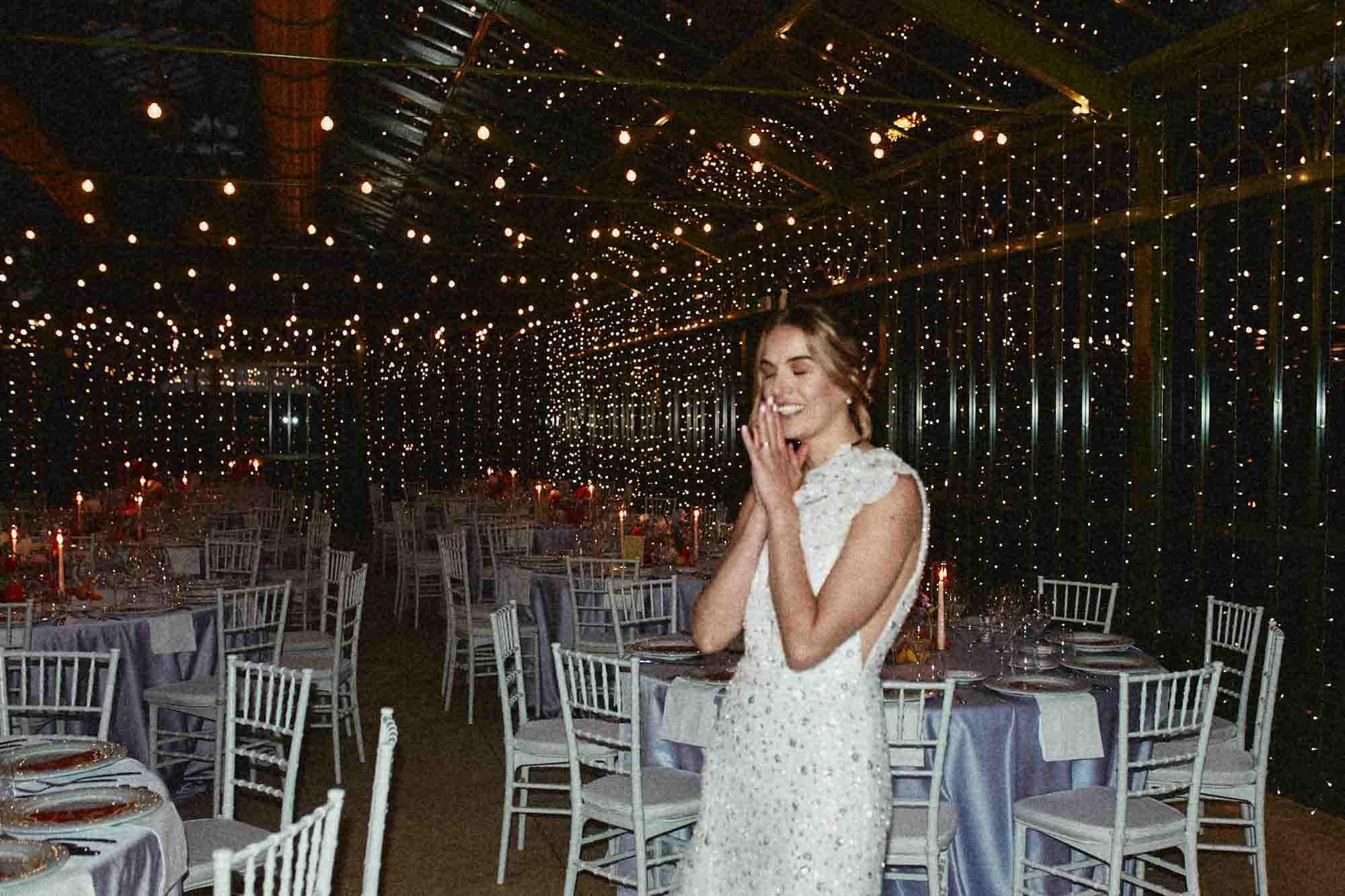 Quando la luce è scesa, il ricevimento si è spostato nella serra in ferro e vetro, illuminata da migliaia di luci a stringa. Ho fotografato Virginia nel momento esatto in cui l’ha vista allestita — uno stupore autentico, spontaneo, impossibile da chiedere di ripetere.